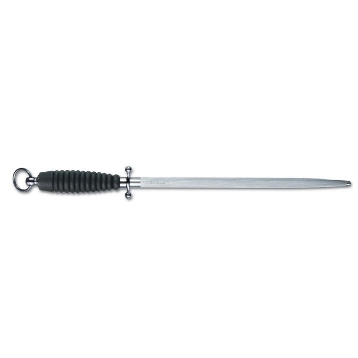 The 30 cm round steel rod is well suited for larger kitchen and butcher knives, allowing smooth and controlled honing strokes. Its ergonomic black handle provides a secure grip and safe handling during use, even in demanding work environments.